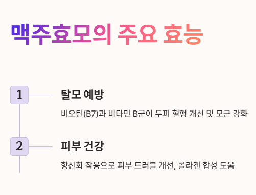 - 비오틴(B7)과 비타민 B군이 풍부해 두피 혈행 개선 및 모근 강화에 효과적이에요.